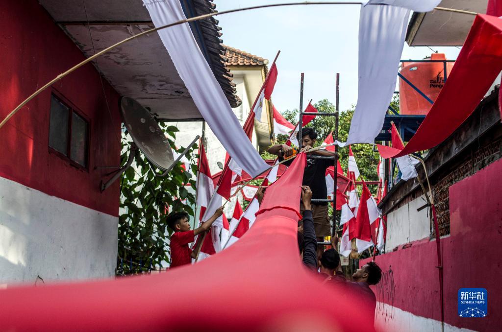 8月14日,在印度尼西亚万隆,人们在居民区布置印尼国旗元素装饰。