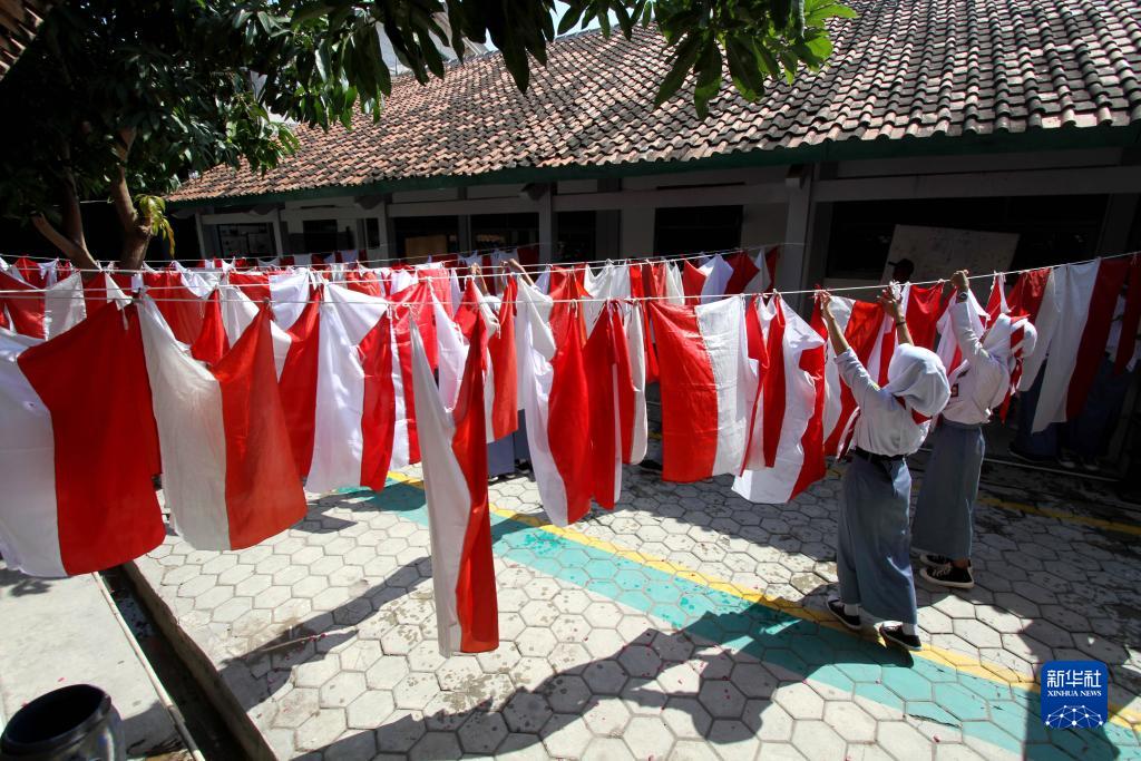 8月15日,在印度尼西亚斯拉根,学生们晾晒洗涤好的印尼国旗,准备用于布置装饰,迎接独立日。
