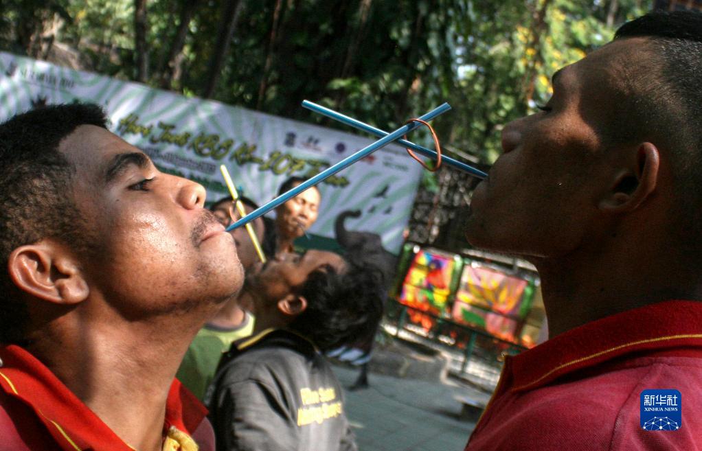 8月15日,在印度尼西亚泗水,人们参加橡皮筋接力趣味游戏,迎接独立日。