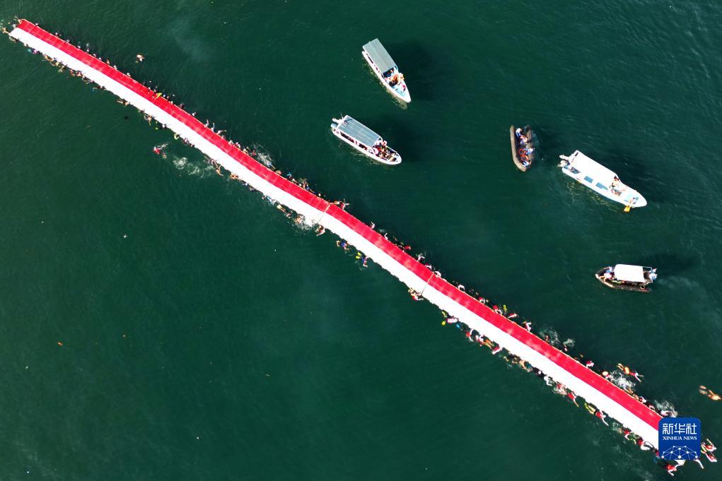 8月12日,在印度尼西亚望加锡海边,人们游泳展开一张长达78米的巨幅印尼国旗(无人机照片)。