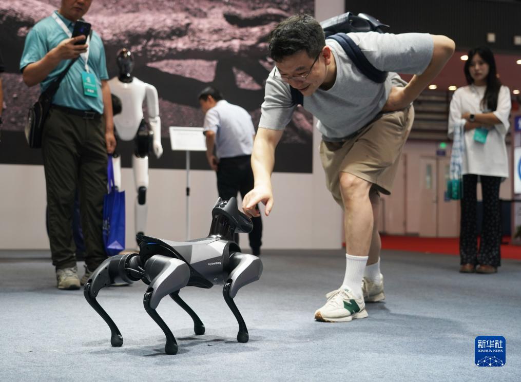 8月16日,观众在2023世界机器人大会现场与一款仿生四足机器人互动。