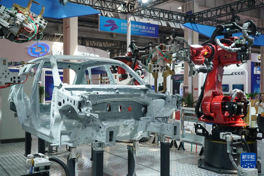 8月16日在2023世界机器人大会现场拍摄的白车身焊点机器人工作站。