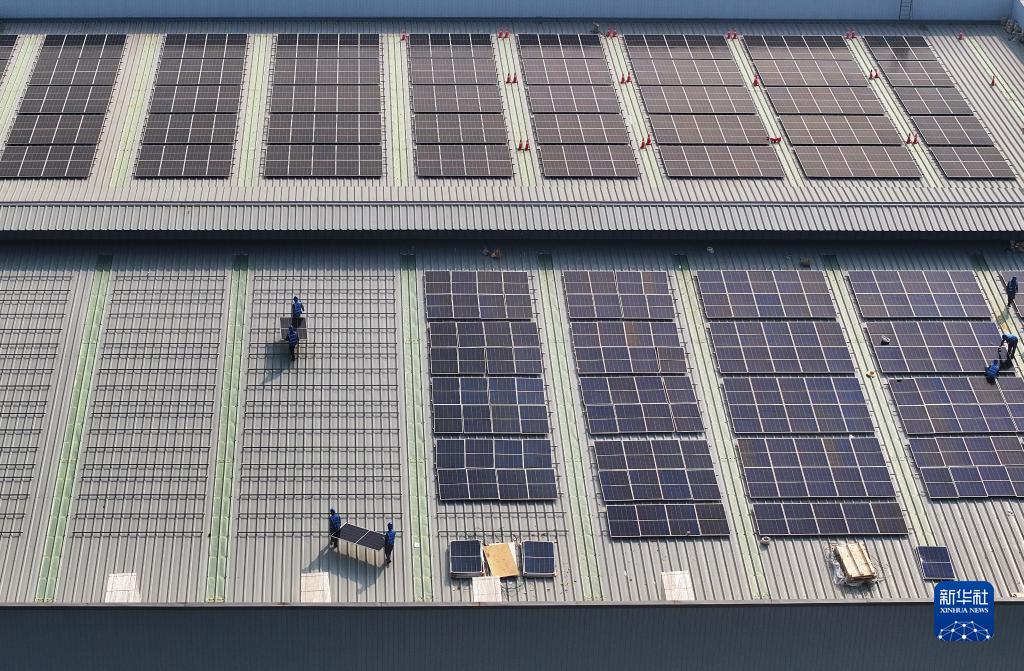 连日来,在河北省唐山市海港经济开发区各企业的厂房屋顶,工人抢抓工期,安装光伏发电板,现场一片忙碌景象。