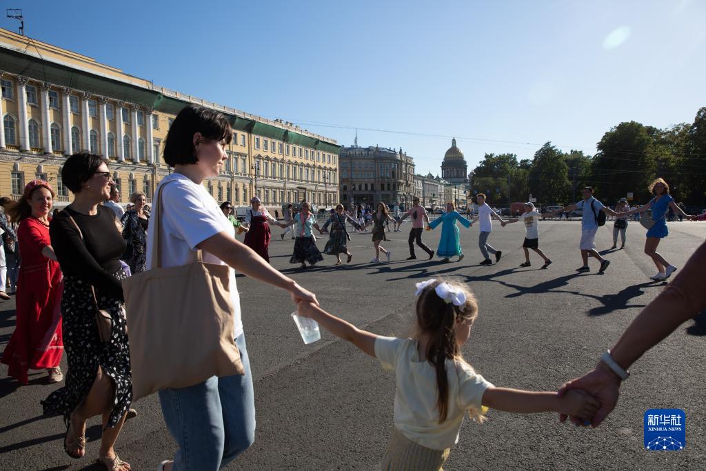 8月15日,民众在俄罗斯圣彼得堡冬宫广场跳圆圈舞。