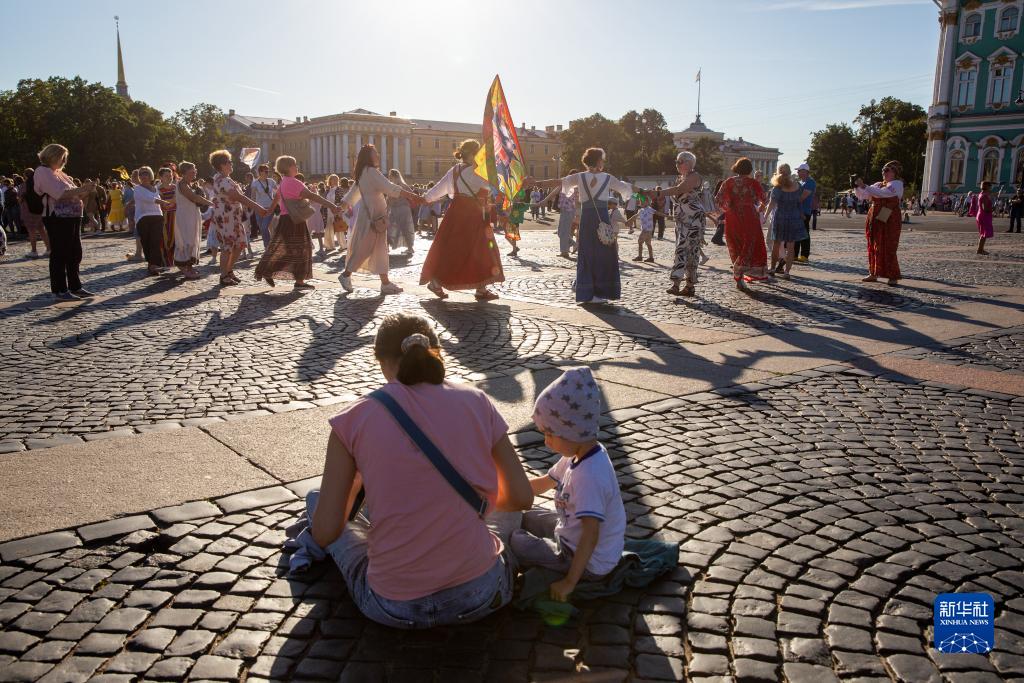 8月15日,在俄罗斯圣彼得堡冬宫广场,一对母子坐在跳圆圈舞的民众旁。