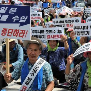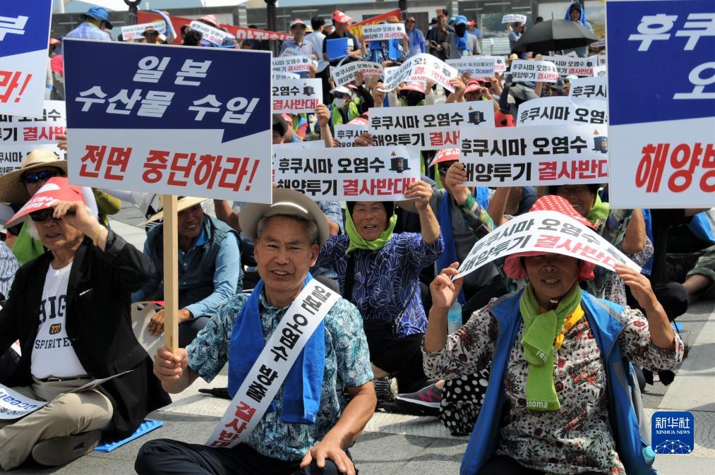 8月16日,在韩国全罗南道高兴郡沿海一带,韩国渔民手持标语参加集会活动,抗议日本核污染水排海计划。
