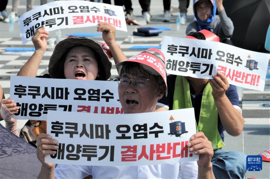 8月16日,在韩国全罗南道高兴郡沿海一带,韩国渔民手持标语参加集会活动,抗议日本核污染水排海计划。