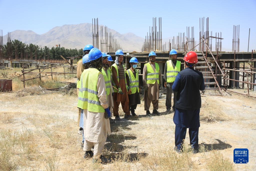 8月13日,努尔·阿齐兹(右一)在喀布尔西郊一处中企承建项目工地指导当地工人工作。