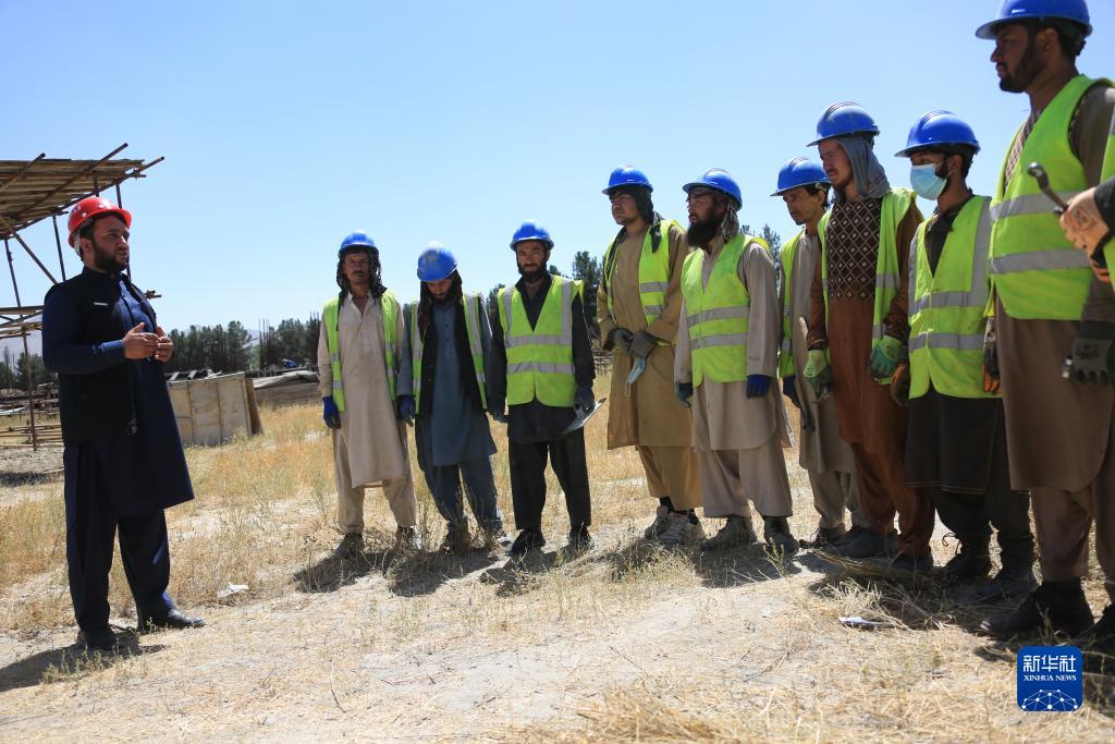 8月13日,努尔·阿齐兹(左一)在喀布尔西郊一处中企承建项目工地指导当地工人工作。