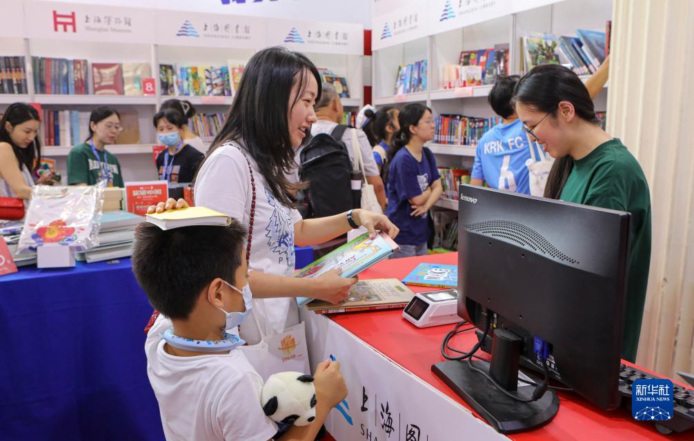 8月16日,读者在上海图书馆展位现场借阅书籍。