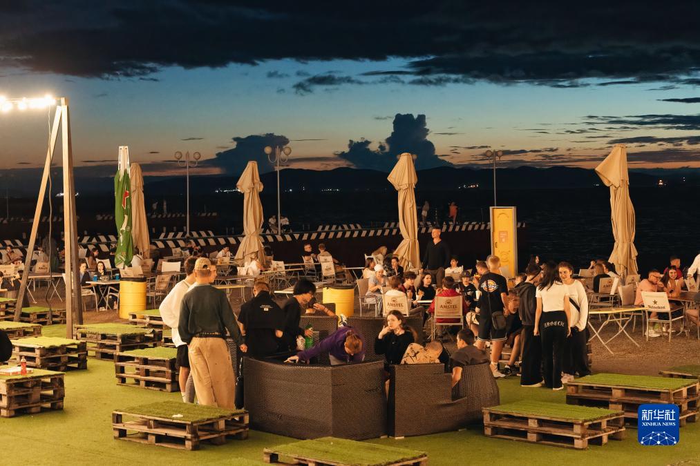 俄罗斯远东城市符拉迪沃斯托克三面环海,旅游业较发达,每当夜幕降临时,人们来到阿穆尔湾的海边娱乐休闲。