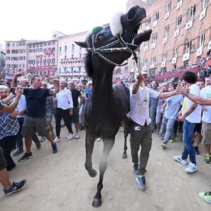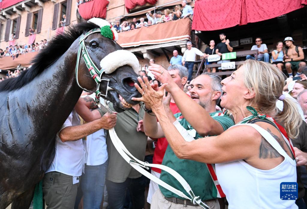 8月16日,在意大利锡耶纳,人们抚摸获胜马匹。