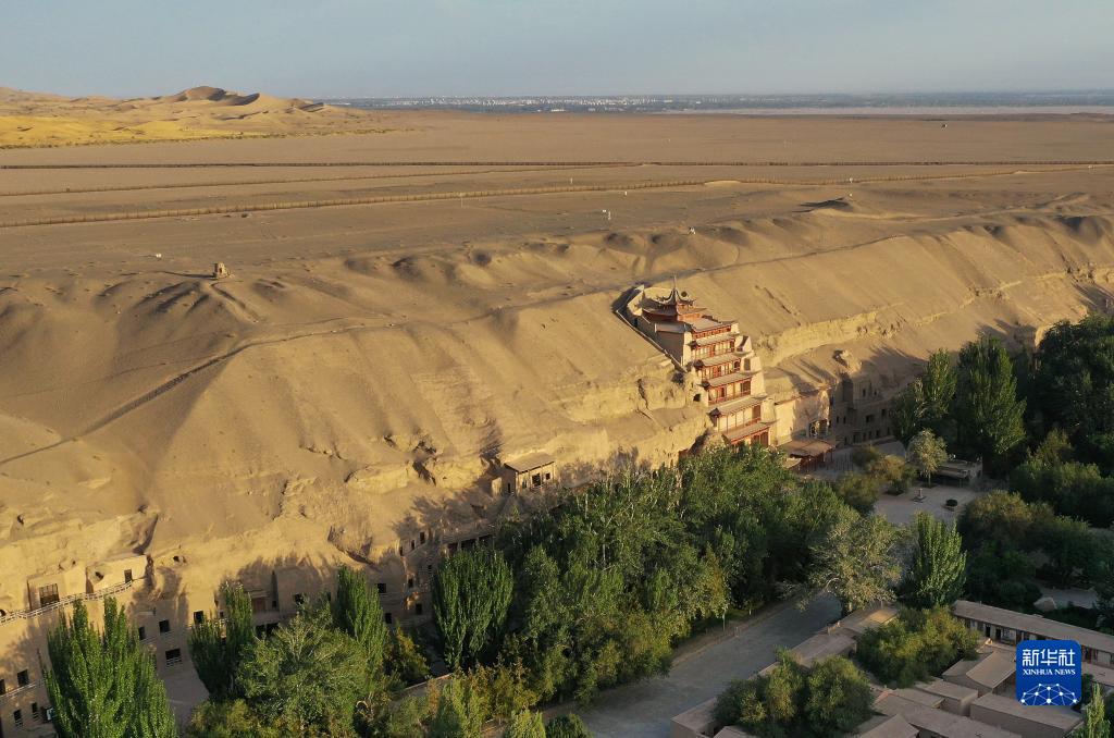 在敦煌莫高窟崖体顶部的戈壁带和沙地上布设有风沙、环境等多种监测设备以及安防监控系统,为莫高窟的保护提供了实时数据支持和安全保护屏障(8月4日摄,无人机照片)。