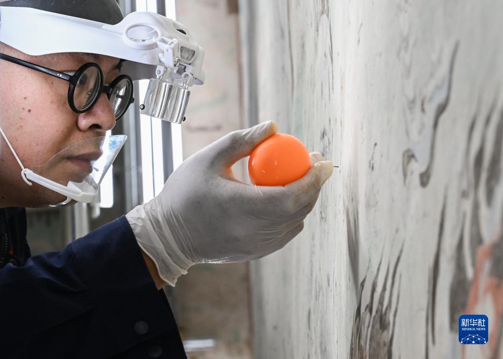 在敦煌莫高窟正在保护修缮的第55窟内,文保工作者对壁画进行加固修复(8月3日摄)。