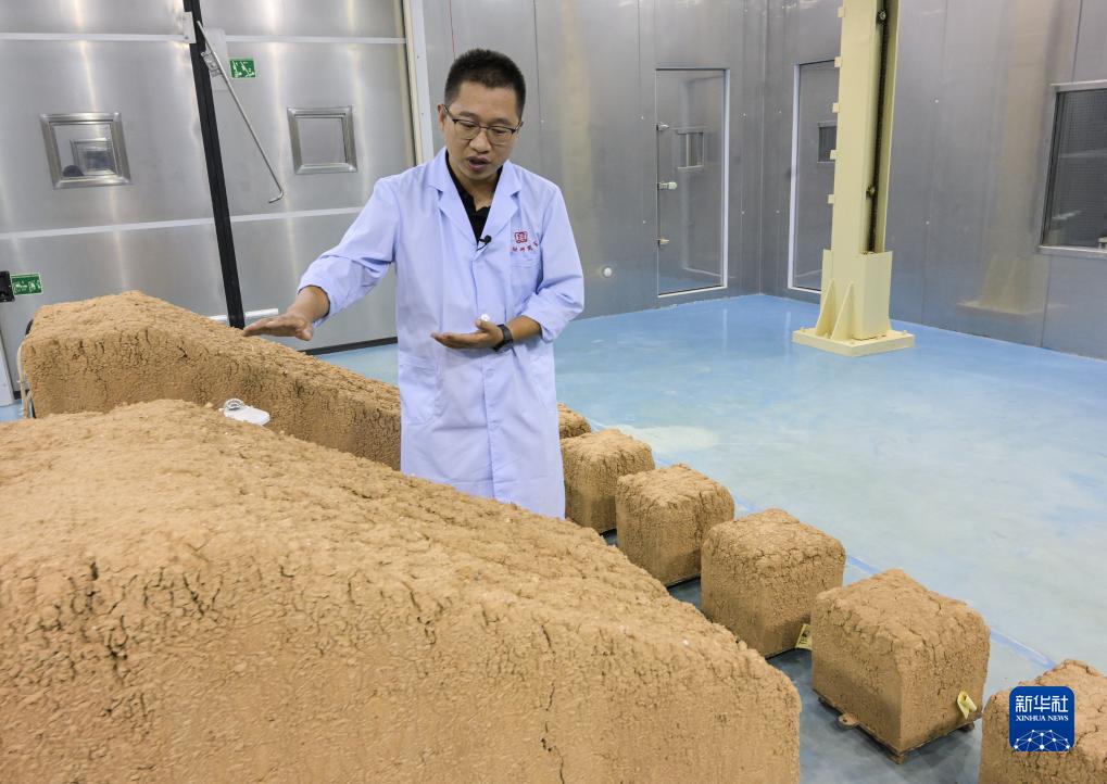 在敦煌研究院多场耦合实验室内,一位工作人员介绍针对陕西西安秦东陵模型所进行的环境模拟实验情况(8月3日摄)。