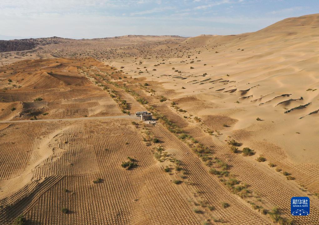 敦煌莫高窟崖体顶部戈壁带和沙地上采用草方格、灌木植物固沙等综合治沙措施保障石窟的防风固沙安全。监测结果表明,经过多年对流沙的持续治理,莫高窟受风沙影响情况得到了有效控制(8月4日摄,无人机照片)。