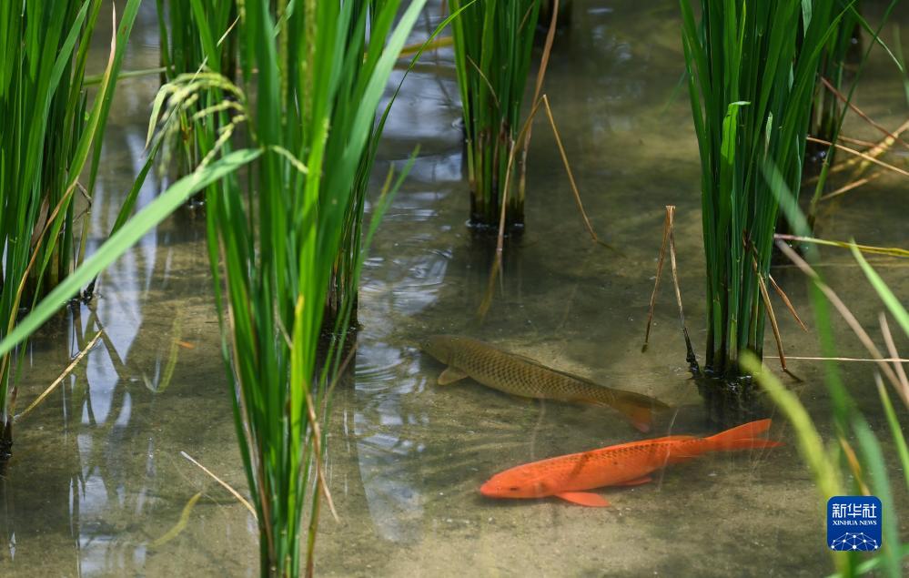 8月17日在青田县方山乡田鱼养殖户吴勇强的稻田里拍摄的养殖的田鱼,当地稻鱼共生系统给百姓带来了“一亩田、百斤鱼、千斤稻、万元钱”的良好收益。