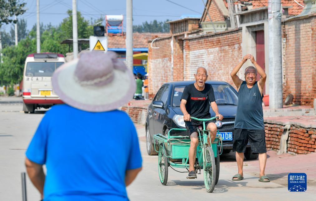 8月17日,在天津市武清区黄花店镇邵七堤村,返村村民相互问候打招呼。