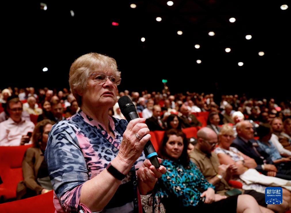 8月15日,在英国伦敦,“里斯本丸”号幸存者丹尼斯·莫利之女丹妮丝·维尼在放映活动上与主创人员交流。