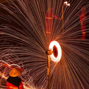 8月16日晚,在鄂尔多斯文化产业园景区,民间艺人表演“铁花秀”。