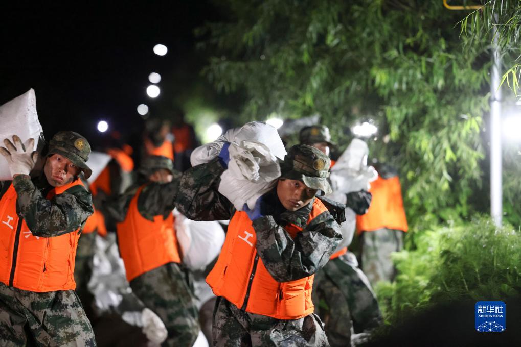 北部战区陆军某旅官兵在哈尔滨双城区万隆乡拉林河多口店段加固堤坝(8月6日摄)。