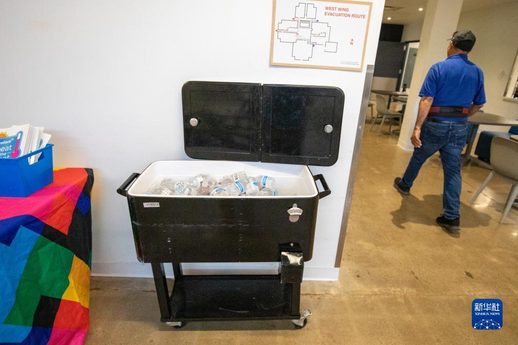 8月17日,工作人员在美国得克萨斯州达拉斯市的一处避暑中心为居民提供免费的水。
