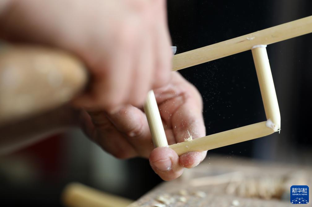 8月17日,崔凯在辽宁省营口市自己家中打磨吉祥轮彩纸风车骨架。