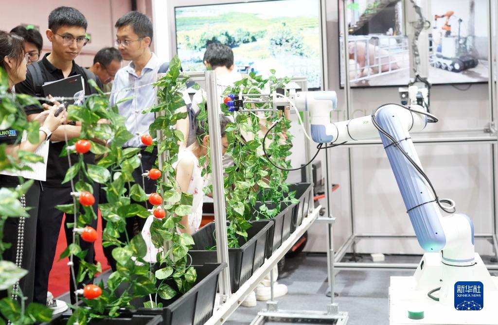 这是在2023世界机器人大会现场拍摄的智能采摘机器人(8月17日摄)。