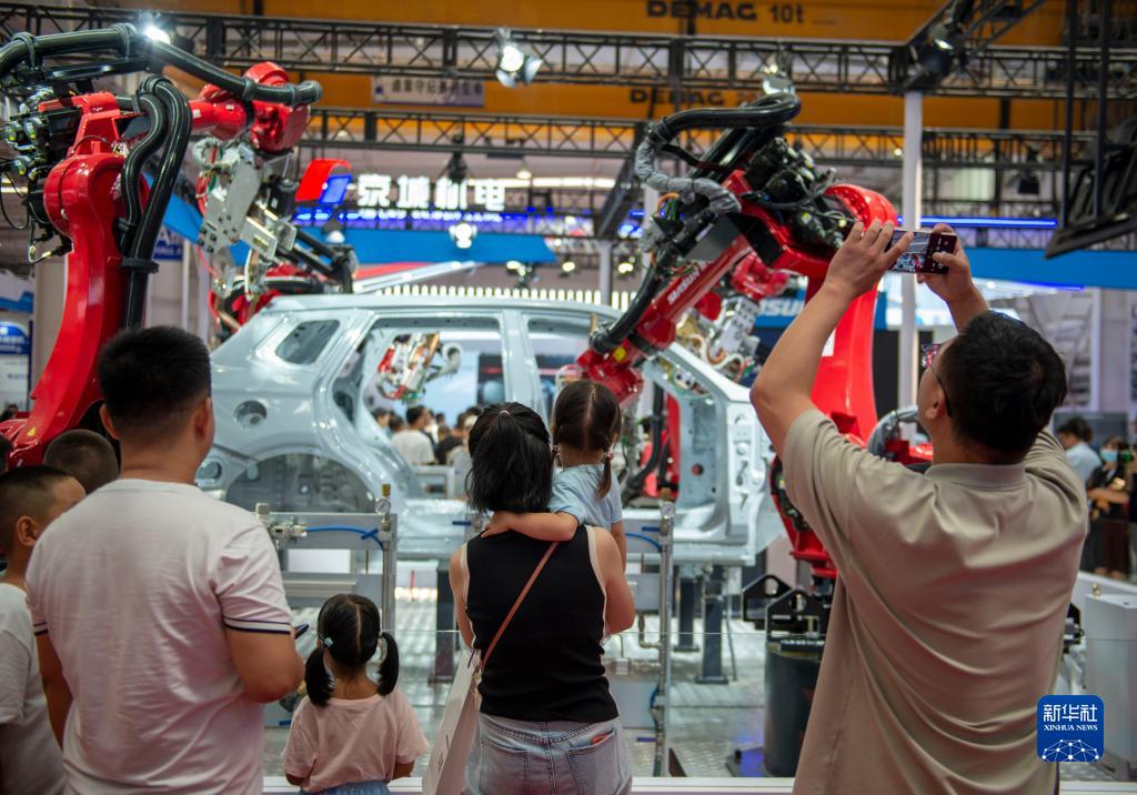 8月17日,参观者在2023世界机器人大会“机器人+制造业”区域参观。
