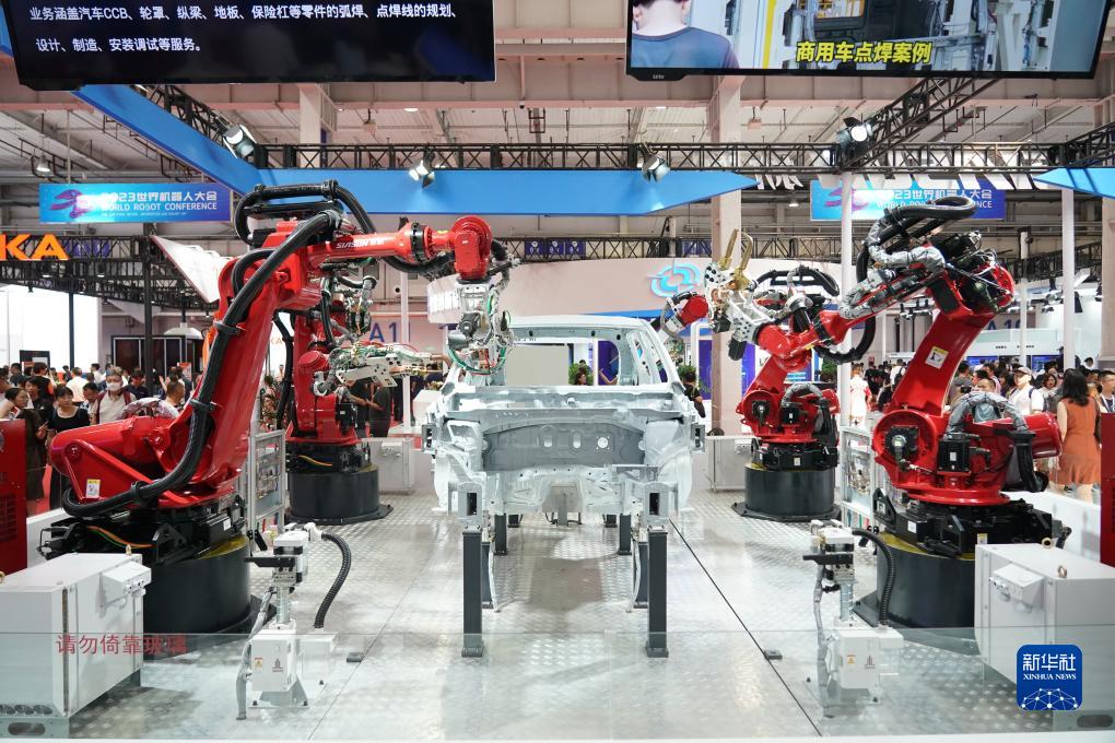 这是8月17日在2023世界机器人大会现场拍摄的白车身焊点机器人工作站。