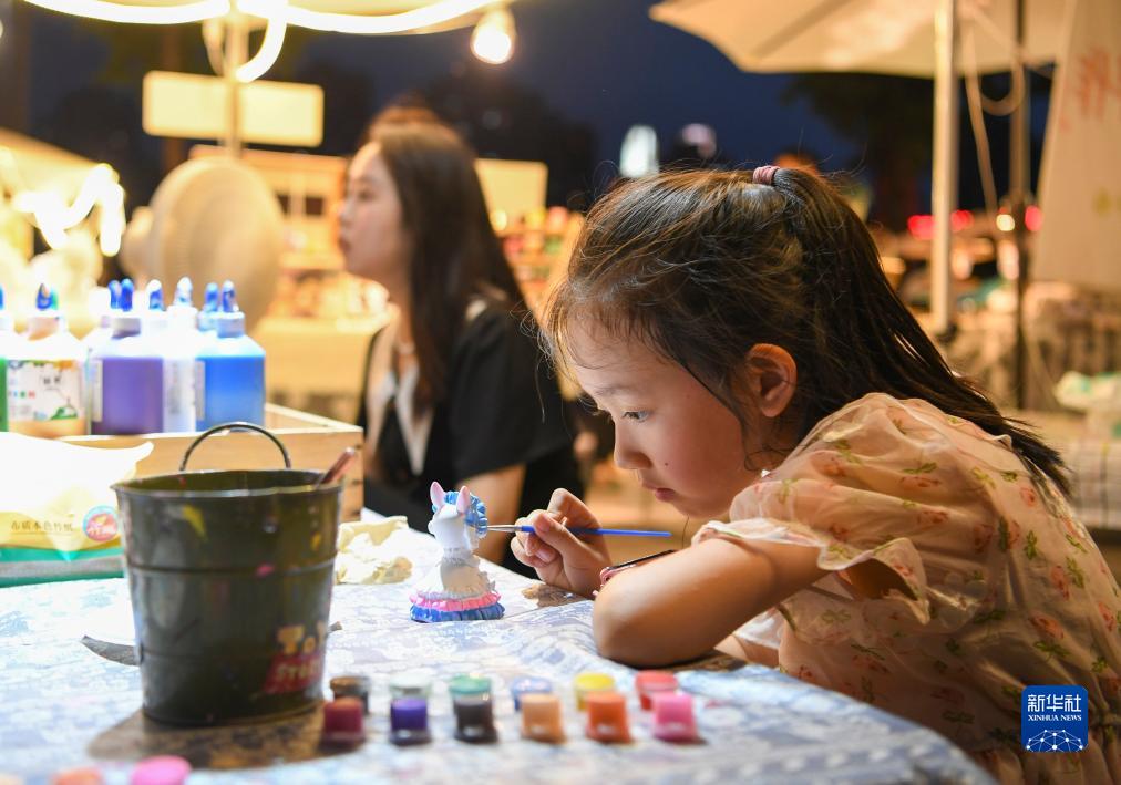 一名女孩在重庆市江北区鎏嘉码头的小熊集市体验石膏娃娃制作(8月4日摄)。