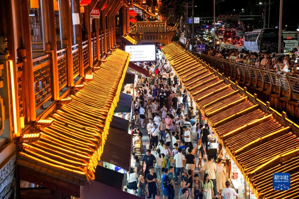 人们聚集在重庆洪崖洞夜市街区(8月3日摄)。