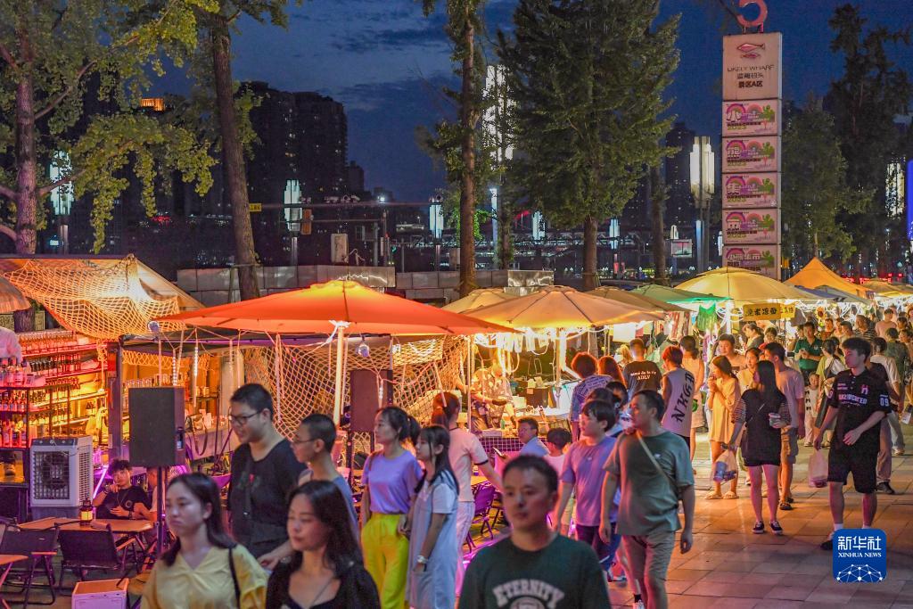人们聚集在重庆市江北区鎏嘉码头的小熊集市(8月4日摄)。