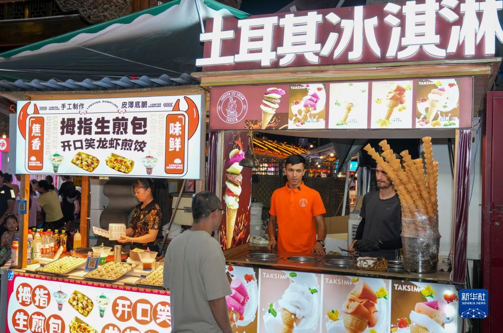 这是重庆洪崖洞夜市街区一处售卖土耳其冰淇淋的店铺(右)(8月3日摄)。