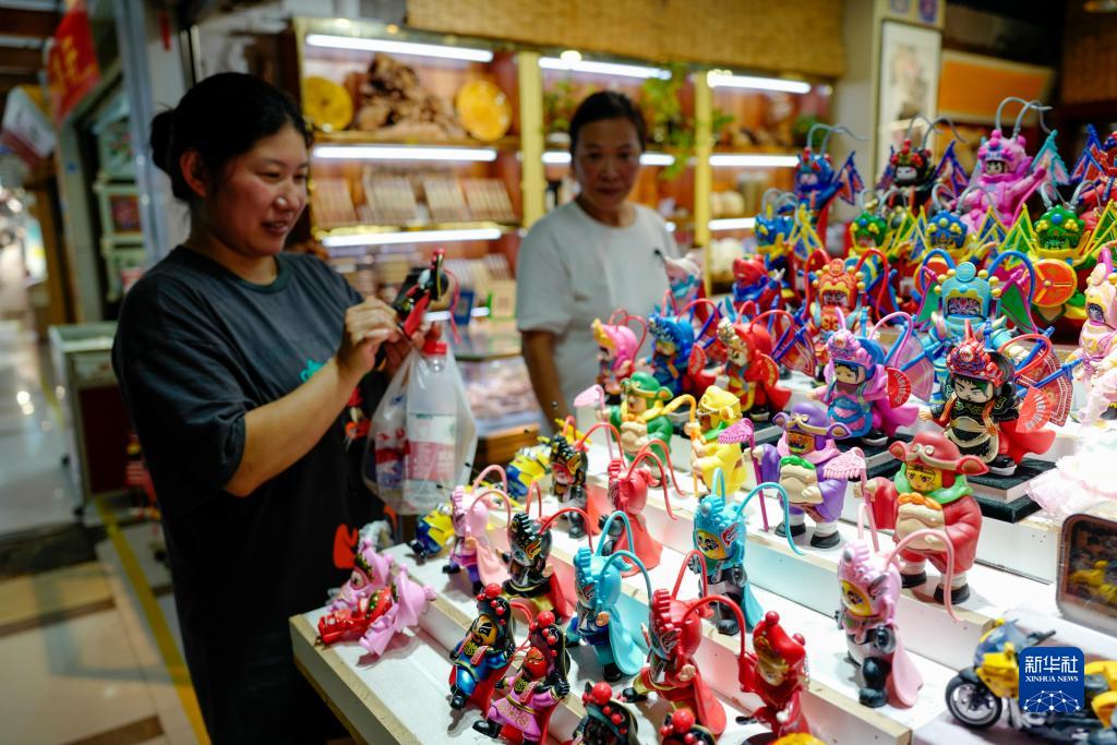 游客在重庆洪崖洞夜市街区的一家店铺内选购民俗纪念品(8月3日摄)。