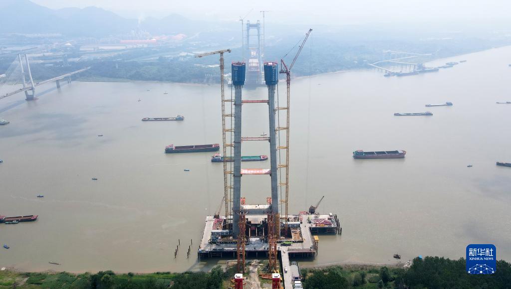 8月18日拍摄的建设中的京台高速铜陵长江公铁大桥,大桥南北两座主塔完成封顶(无人机照片)。