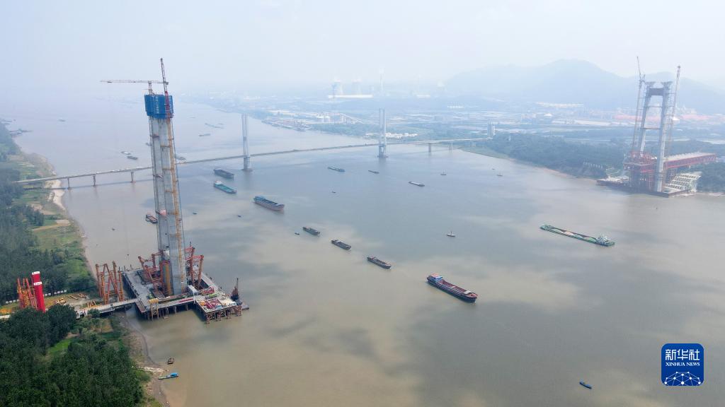 8月18日拍摄的建设中的京台高速铜陵长江公铁大桥,大桥南北两座主塔完成封顶(无人机照片)。