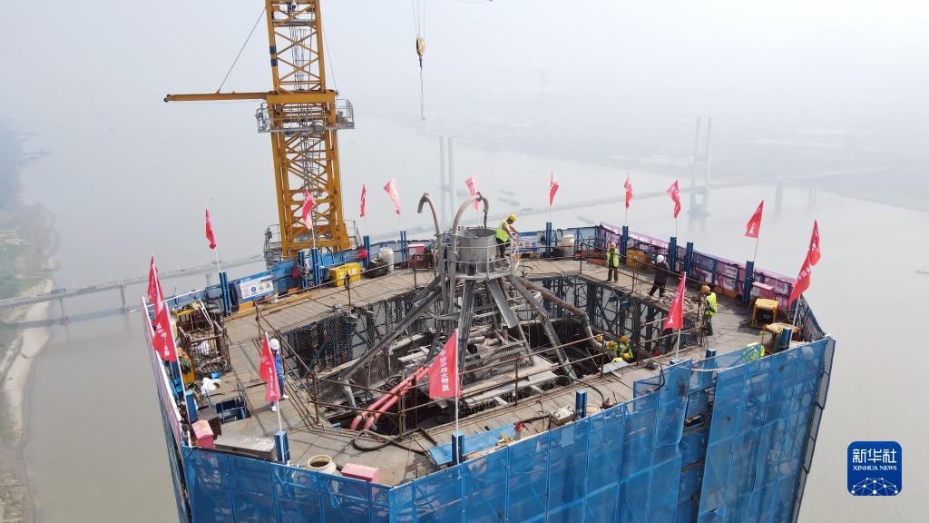 8月18日拍摄的京台高速铜陵长江公铁大桥3号主塔封顶施工现场(无人机照片)。