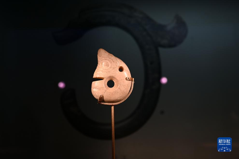 8月18日在中国国家博物馆“中国古代玉器”专题展览上拍摄的红山文化玦形龙。