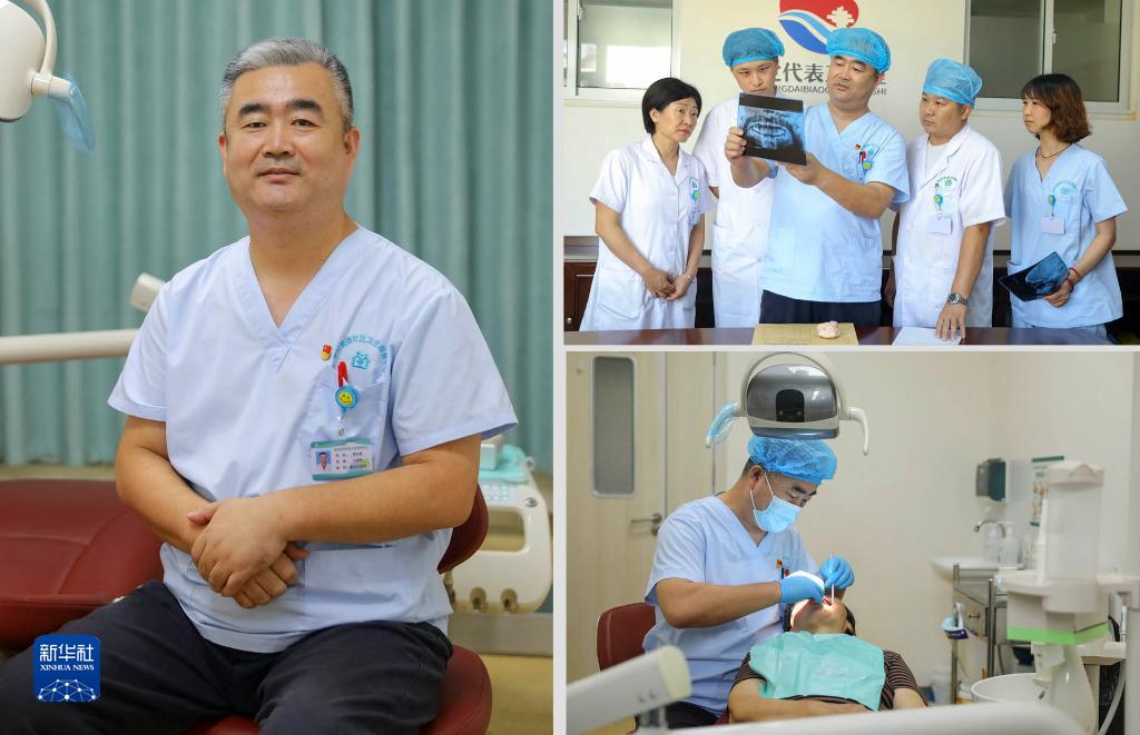 这是山东省青岛市李沧区李村街道社区卫生服务中心口腔科副主任医师贾兆群,从医31年(拼版照片,均为8月17日摄)。左图为贾兆群在山东省青岛市李沧区李村街道卫生服务中心口腔科留影;右上图为贾兆群(左三)和同事们研讨病例;右下图为贾兆群在给患者进行口腔修复治疗。