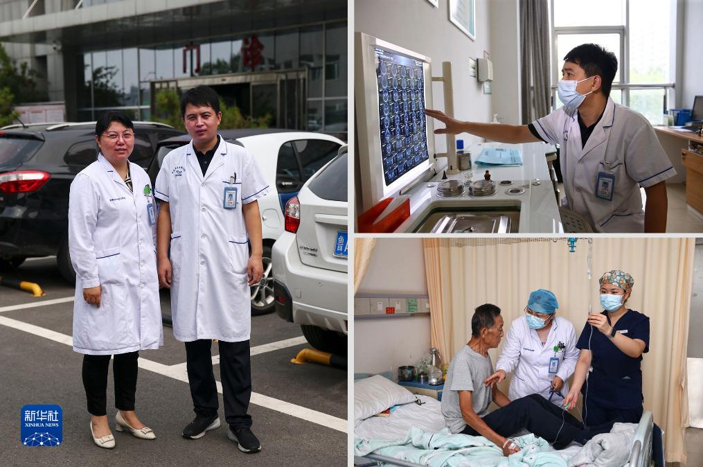 这是山东省济南市市中区人民医院科耳鼻喉科主治医生许锡博和他的妻子、呼吸科主治医生冯玉钰,两人均从医16年(拼版照片)。左图为许锡博和冯玉钰夫妻在医院门诊楼前留影(8月18日摄);右上图为许锡博在办公室查看病人CT片(8月17日摄);右下图为冯玉钰(左二)在病房与病人交谈了解病情(8月17日摄)。