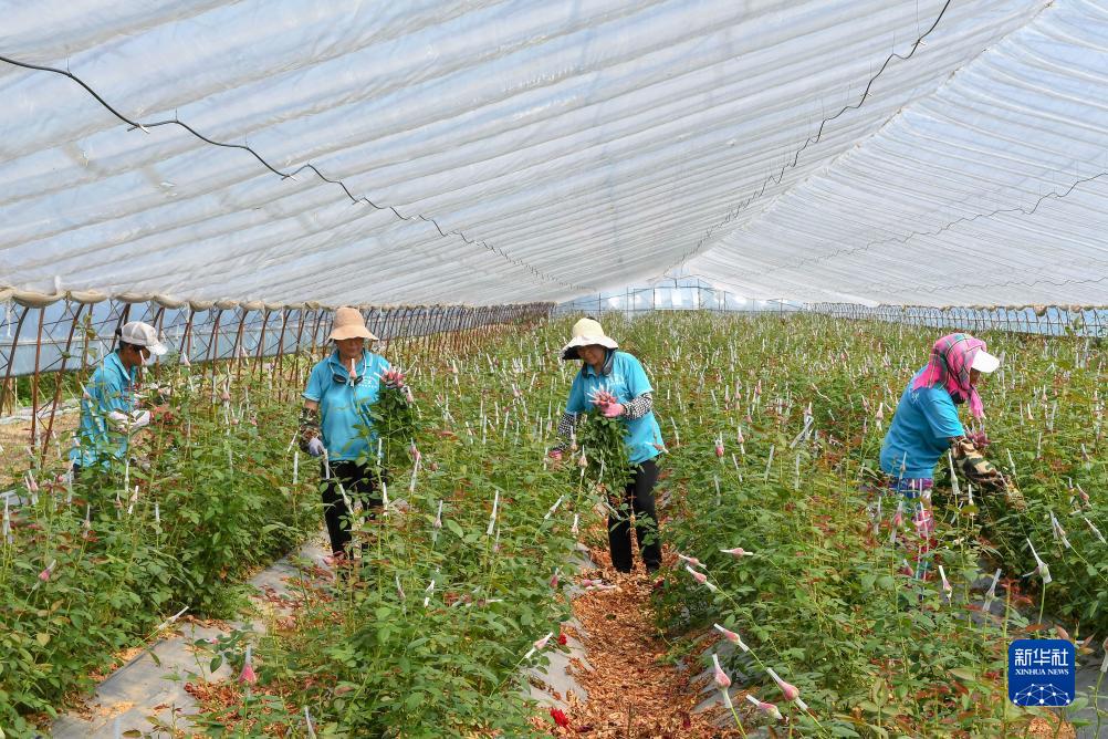 临近七夕,位于吉林省德惠市朱城子镇沿河村的程雪家庭农场玫瑰大棚内一派繁忙景象。负责人杨雪带领村民关注花朵长势,计算着花期,适时进行采摘。