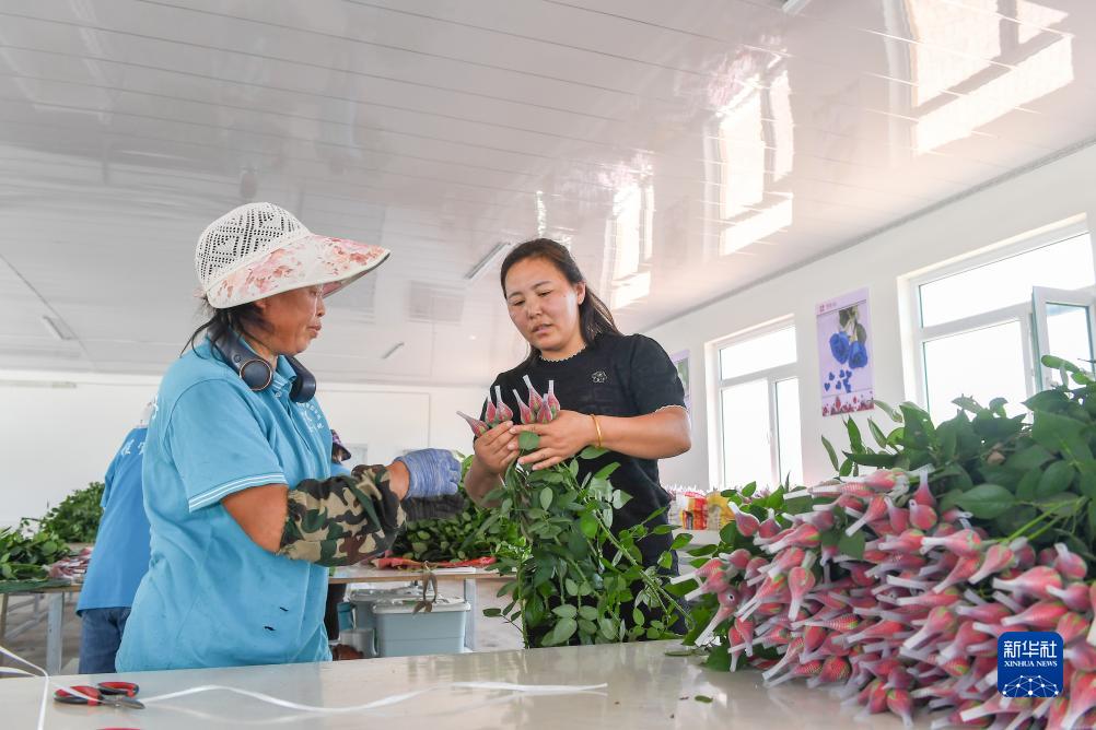 临近七夕,位于吉林省德惠市朱城子镇沿河村的程雪家庭农场玫瑰大棚内一派繁忙景象。负责人杨雪带领村民关注花朵长势,计算着花期,适时进行采摘。