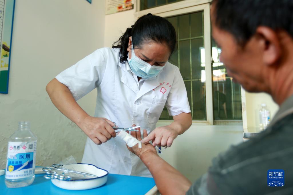 罗海香(左)在村卫生室给村民包扎伤口(8月16日摄)。