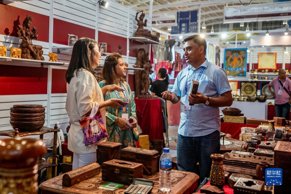 8月18日,尼泊尔展区的参展商(右)在推介特色商品。
