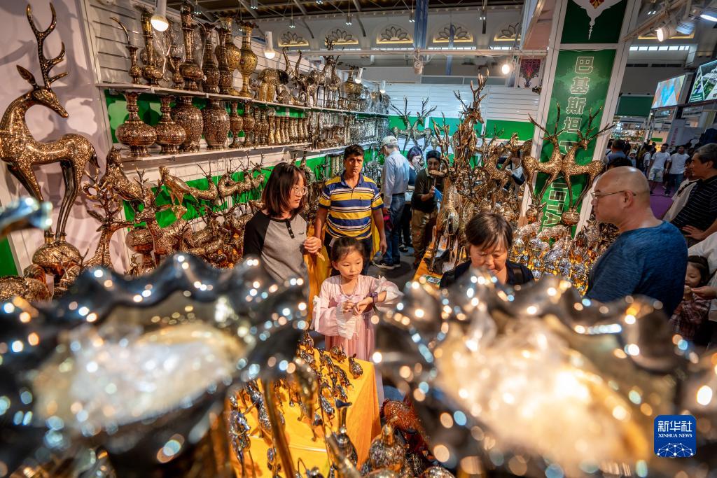 8月18日,参观者在巴基斯坦展区参观、选购商品。