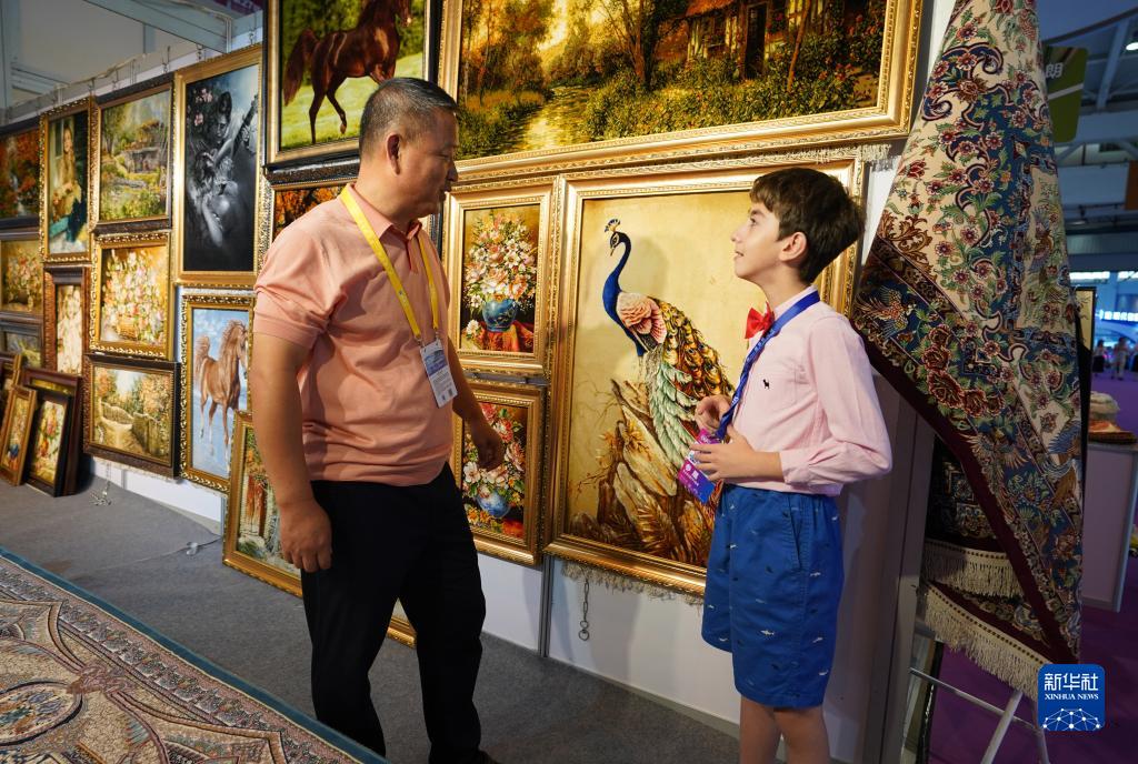一名伊朗小男孩(右)在展位上向参观者介绍挂毯(8月16日摄)。