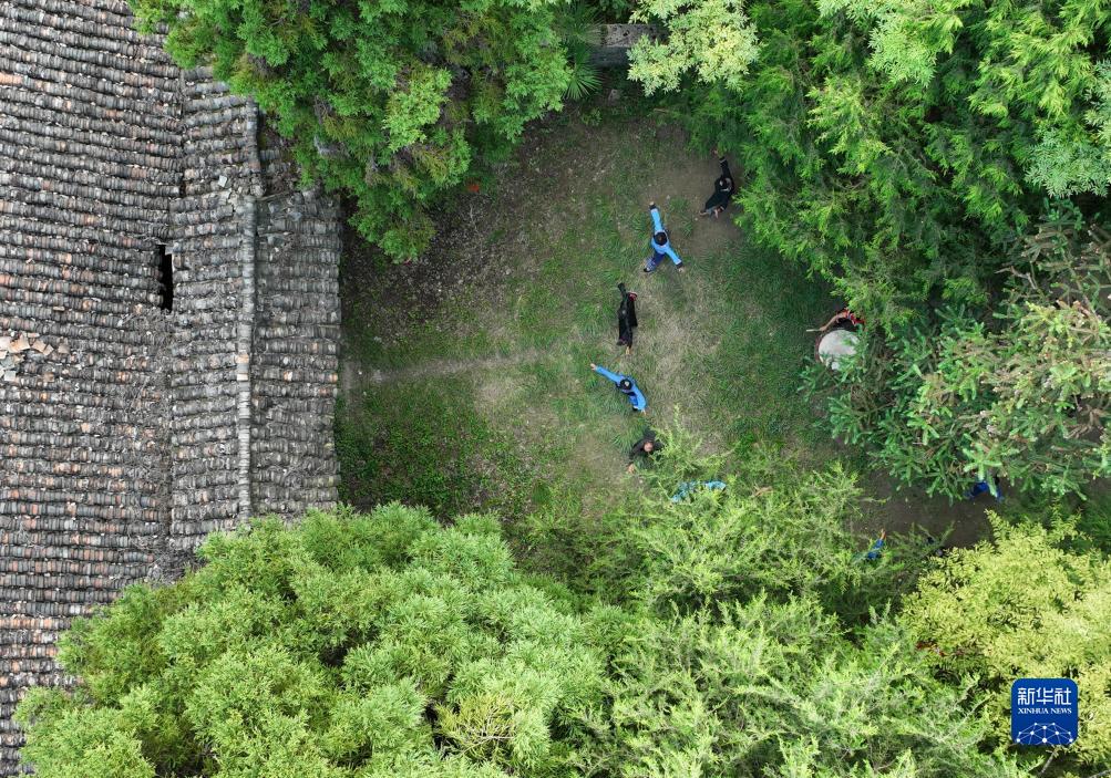 8月18日,舍米湖村村民在有着数百年历史的“摆手堂”前跳起摆手舞(无人机照片)。