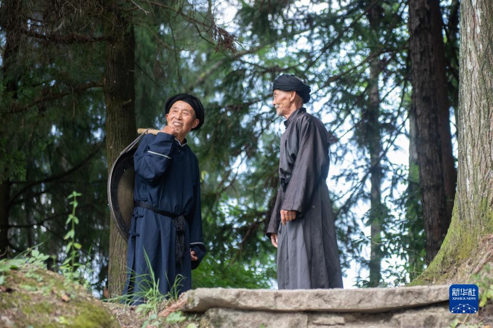 8月18日,舍米湖村村民彭大丙(右)和彭大照商量近期表演事宜。