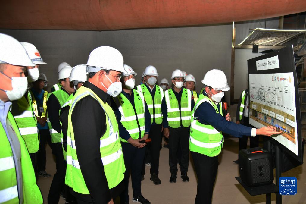 8月17日,泰国总理巴育(中)在沙拉武里府视察中泰铁路施工段。